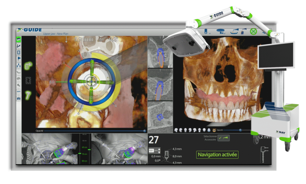 • Ou à l’aide d’un guidage dynamique, grâce à un système de navigation chirurgicale assistée par ordinateur. Dans ce cas, la planification implantaire rigoureuse effectuée en amont est transposée en temps réel dans la bouche du patient. Le système permet de suivre sur un écran, en direct, le positionnement spatial exact des instruments dans les structures anatomiques du patient, comme si l’on disposait d’un GPS chirurgical.