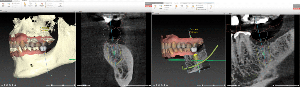 À partir des données recueillies lors de la première consultation ( Cone Beam 3D, empreinte optique, examen clinique et anamnèse médicale ) une planification implantaire tridimensionnelle est réalisée à l’aide de logiciels spécialisés.