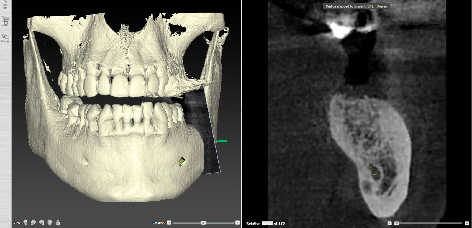 • Positionner virtuellement l’implant de manière idéale, en respectant à la fois les contraintes anatomiques (canal mandibulaire, sinus, racines adjacentes, structures nerveuses) et les contraintes prothétiques (axe d’émergence, espace disponible, équilibre occlusal, esthétique) ;